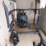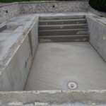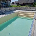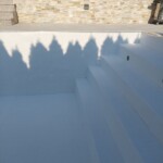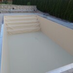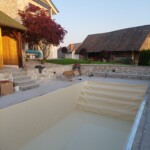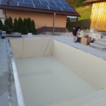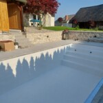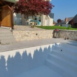 Izvedba je vključevala natančno pripravo bazenske školjke, hidroizolacijo, vgradnjo folije ter namestitev tehničnega sistema za optimalno delovanje.