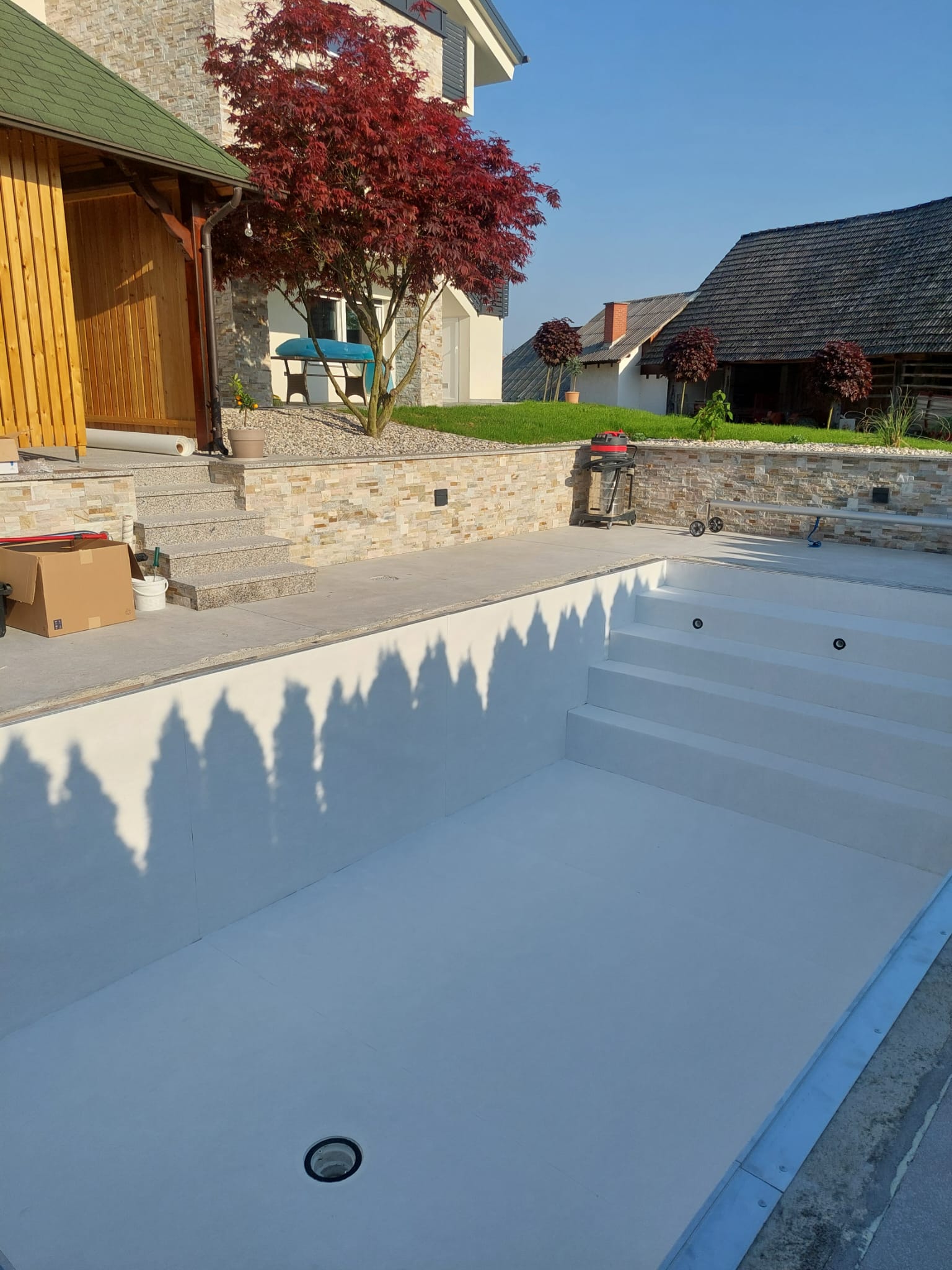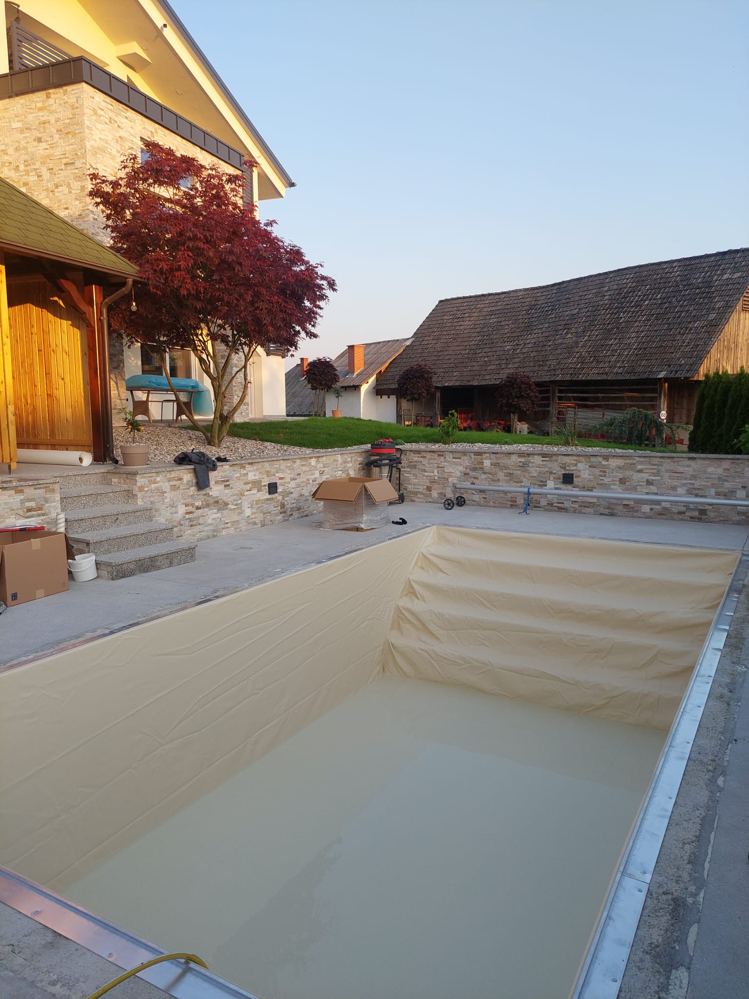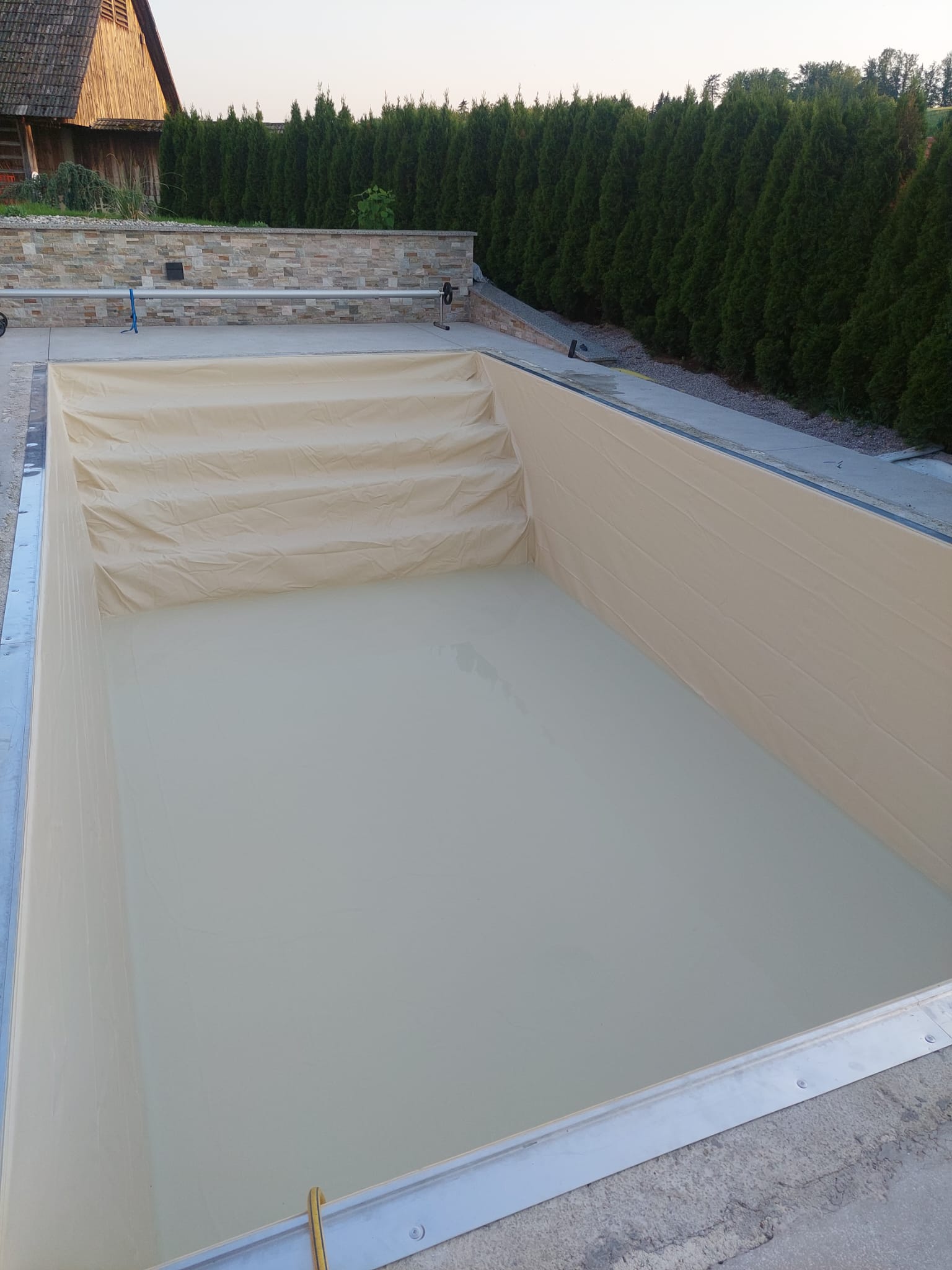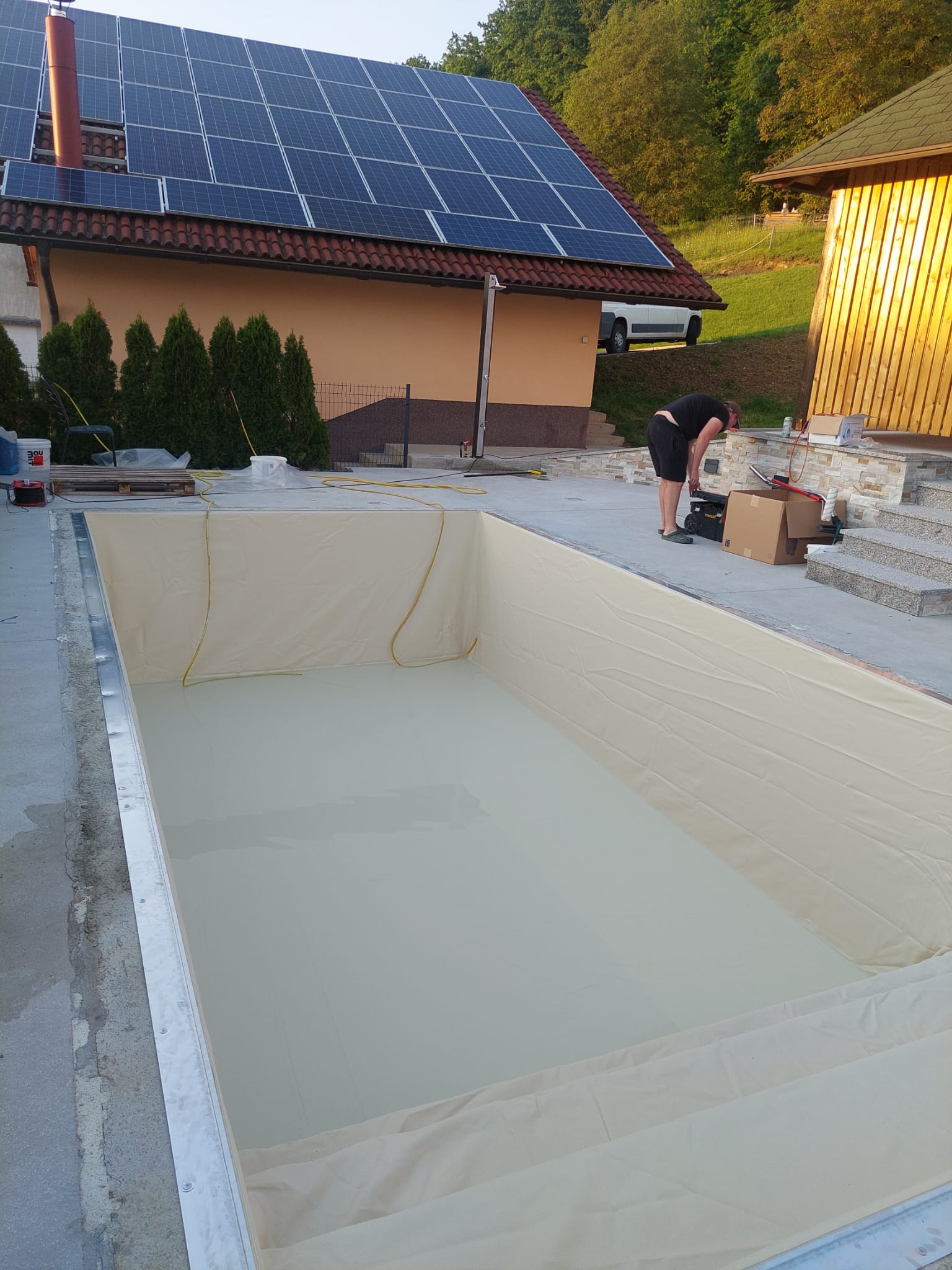 Izvedba je vključevala natančno pripravo bazenske školjke, hidroizolacijo, vgradnjo folije ter namestitev tehničnega sistema za optimalno delovanje.