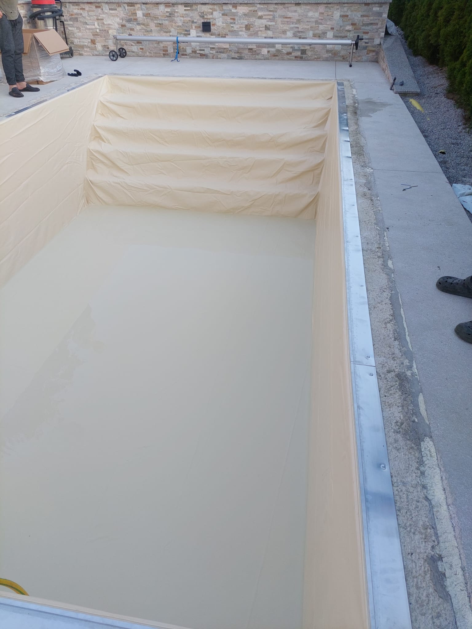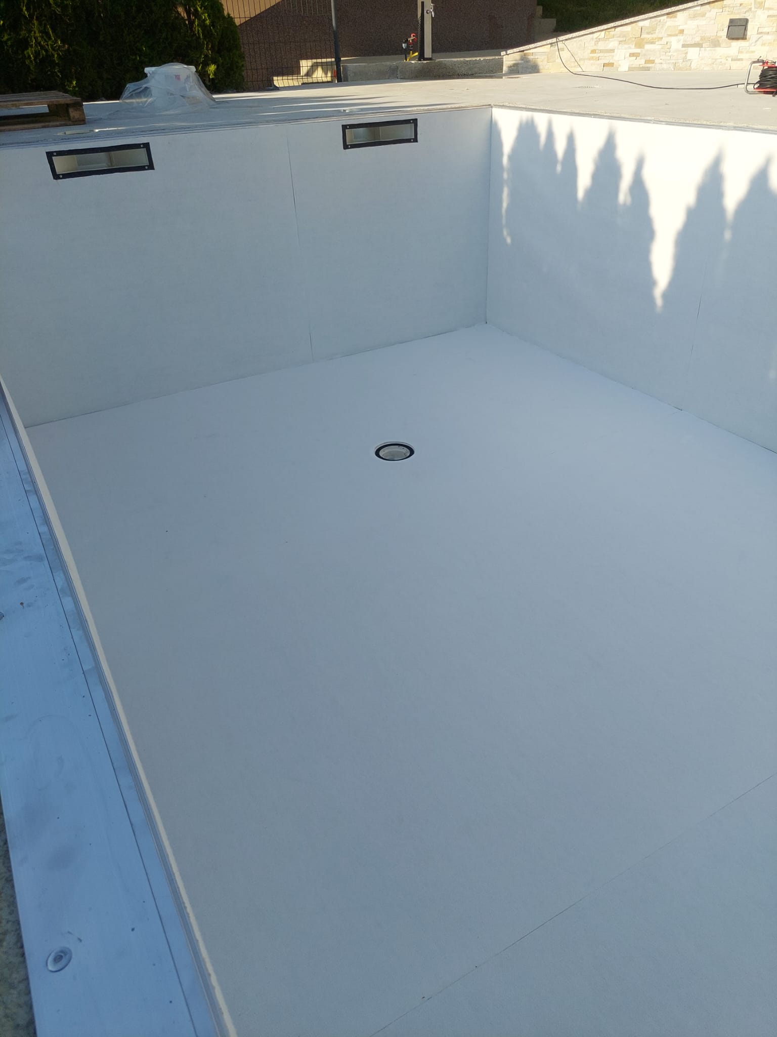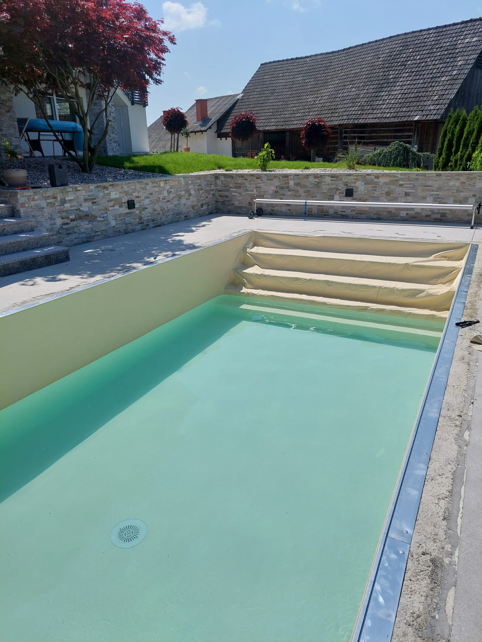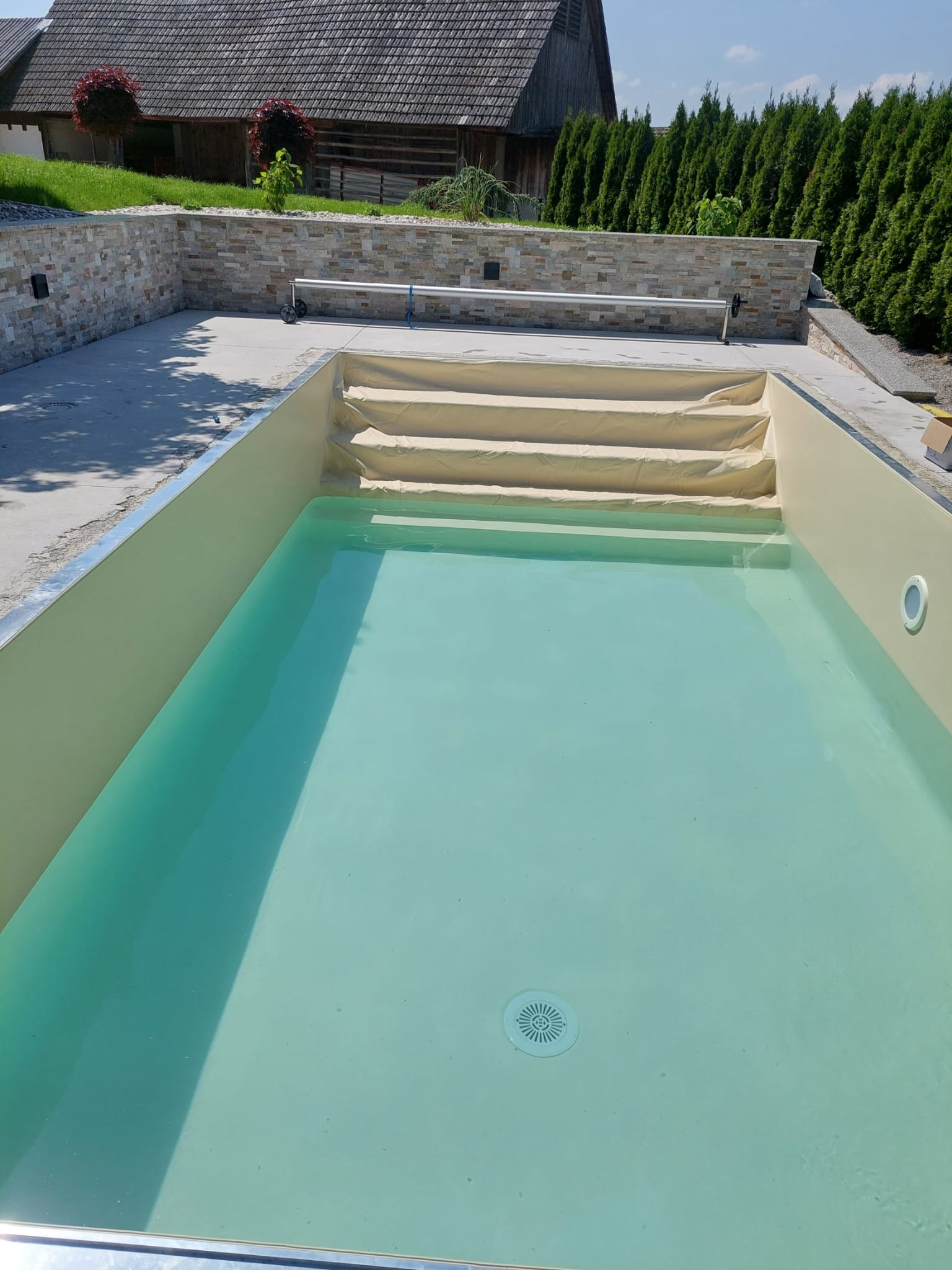 Izvedba je vključevala natančno pripravo bazenske školjke, hidroizolacijo, vgradnjo folije ter namestitev tehničnega sistema za optimalno delovanje.