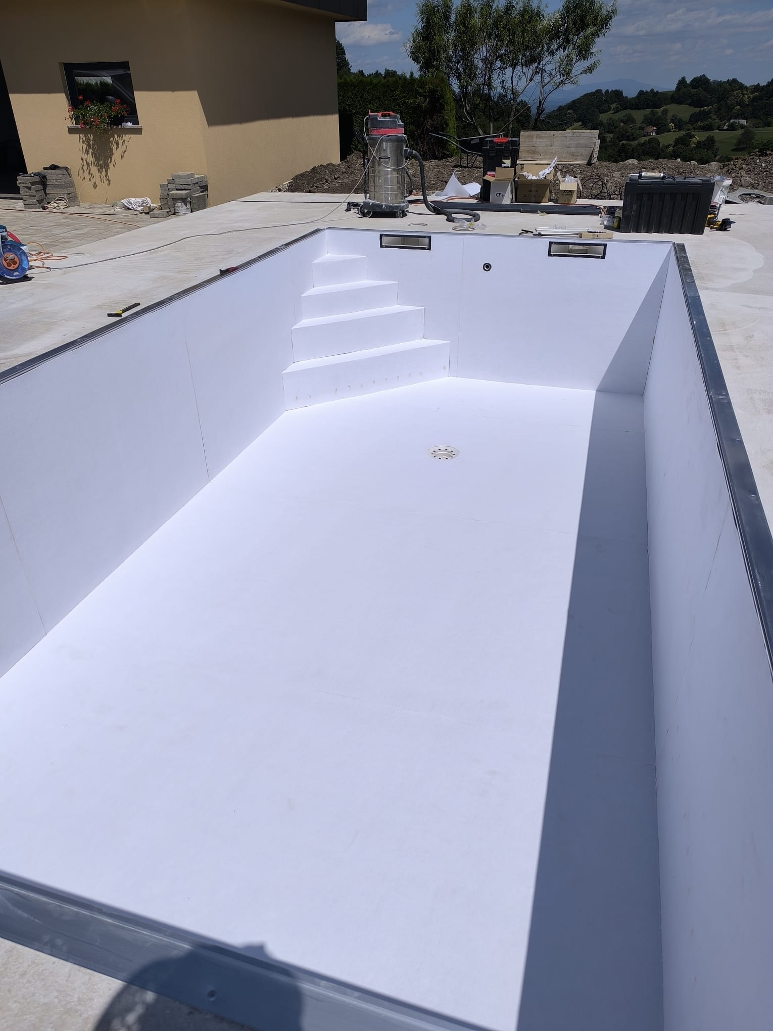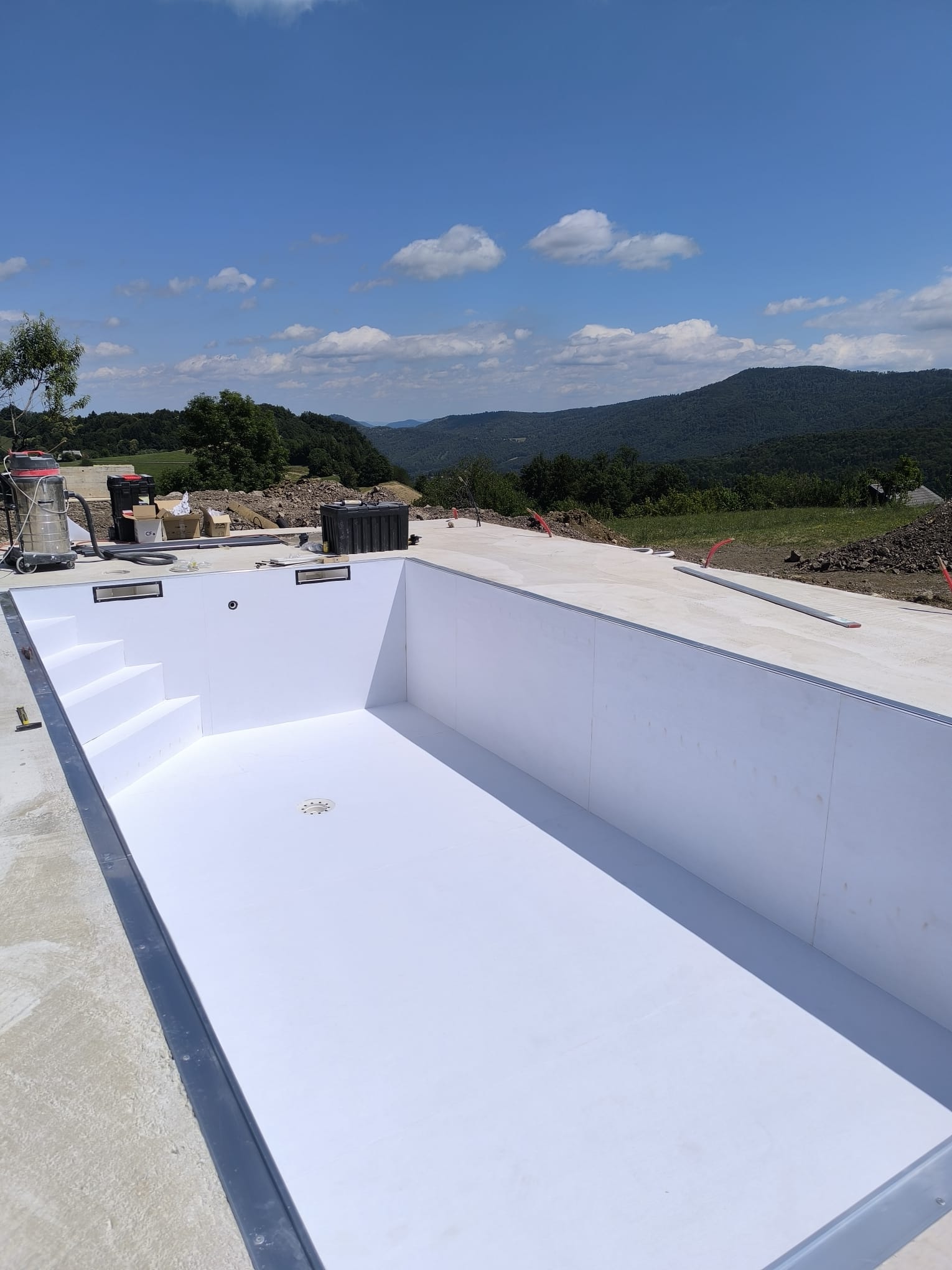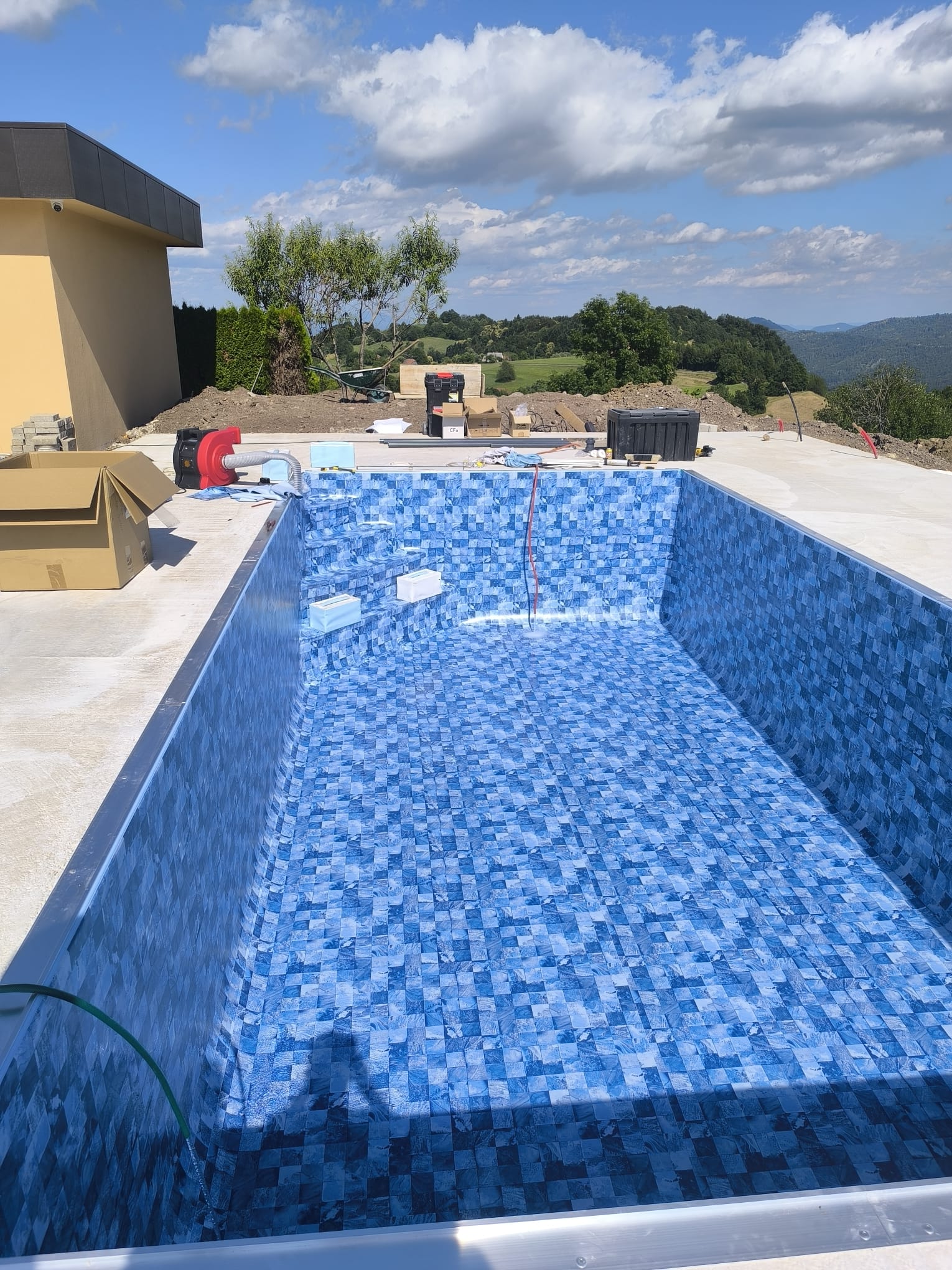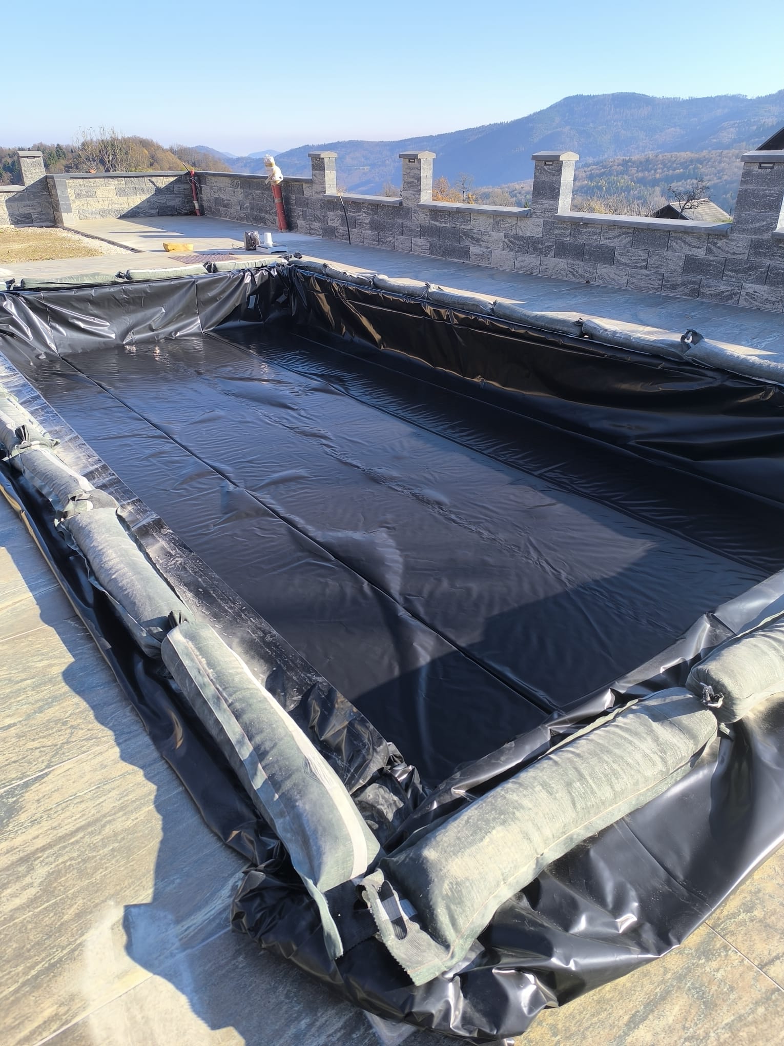 Bazen je bil izveden z natančno pripravo podlage, strokovno izvedbo tesnjenja in estetsko dovršeno montažo folije nove generacije.