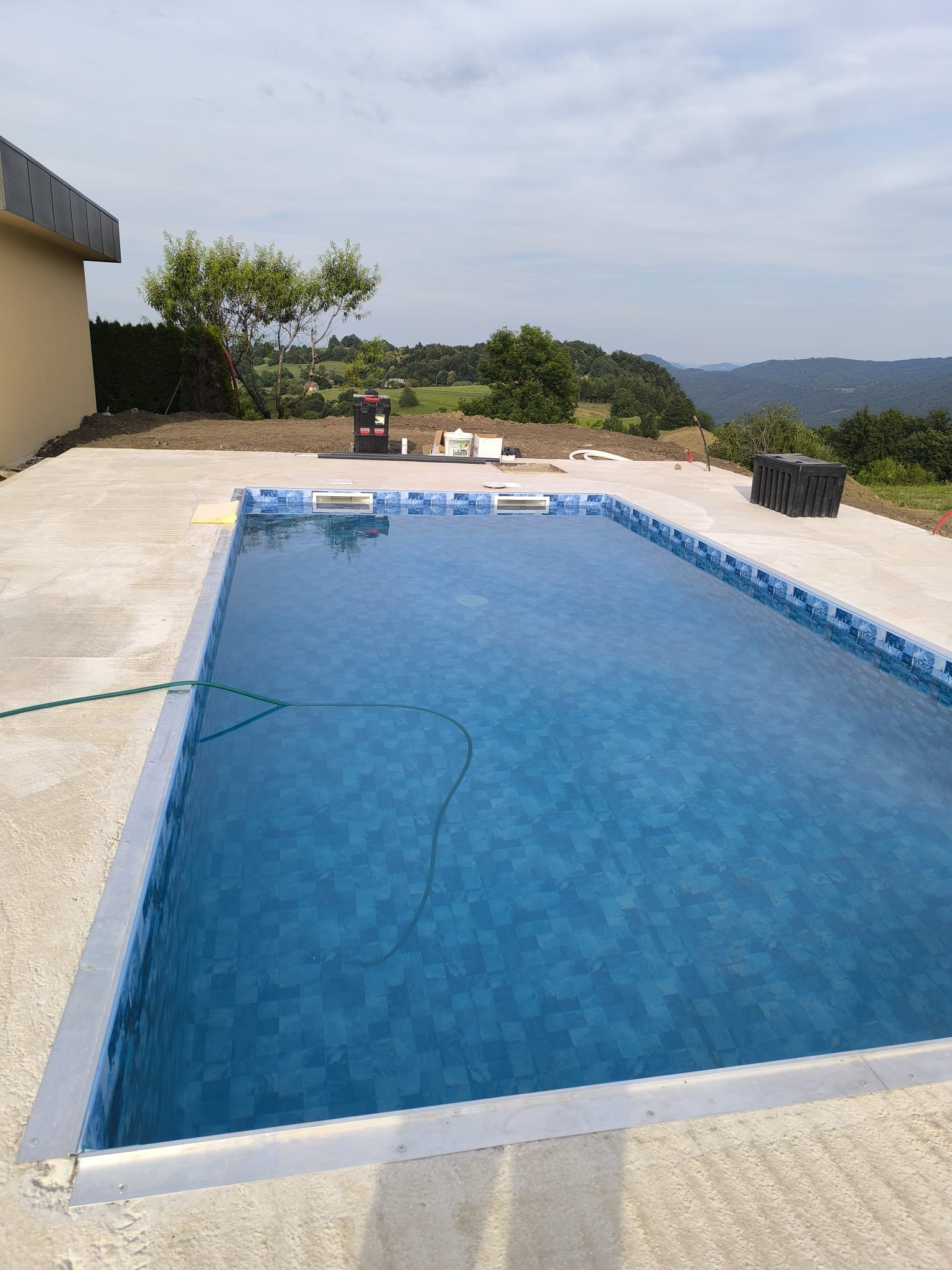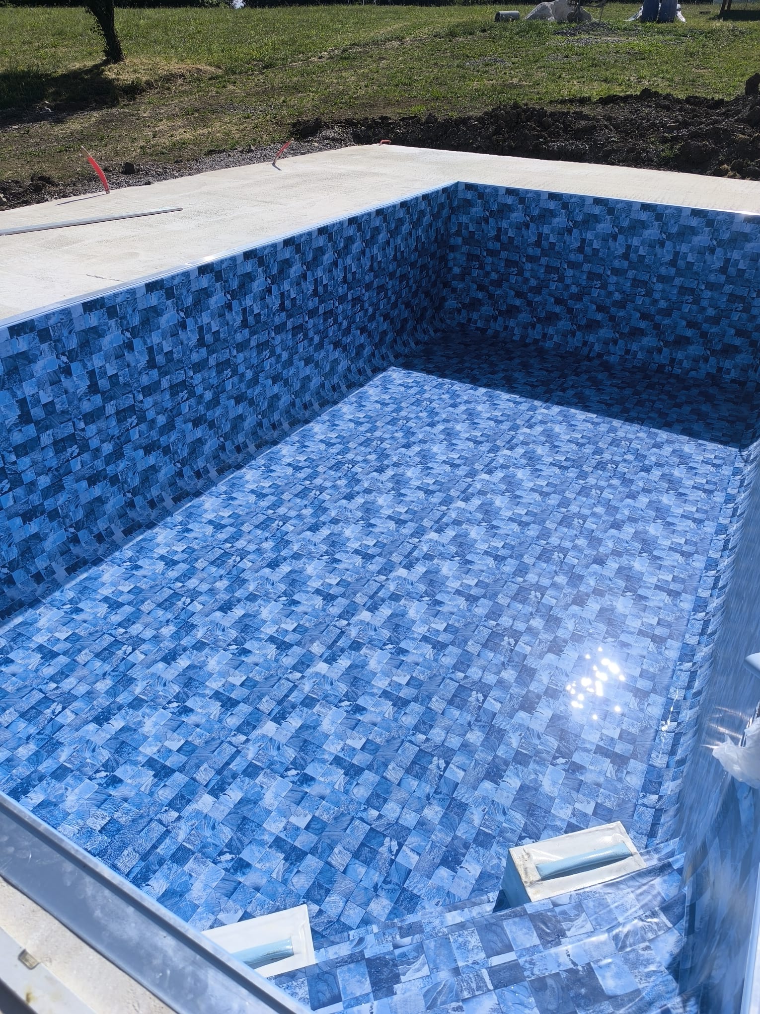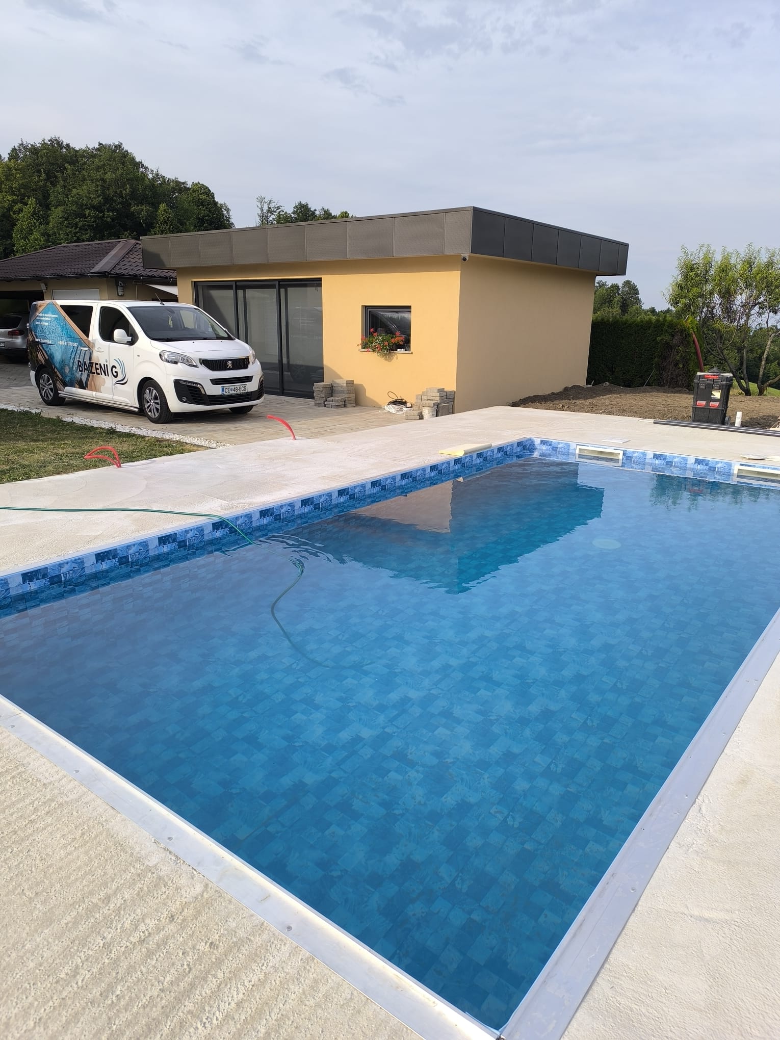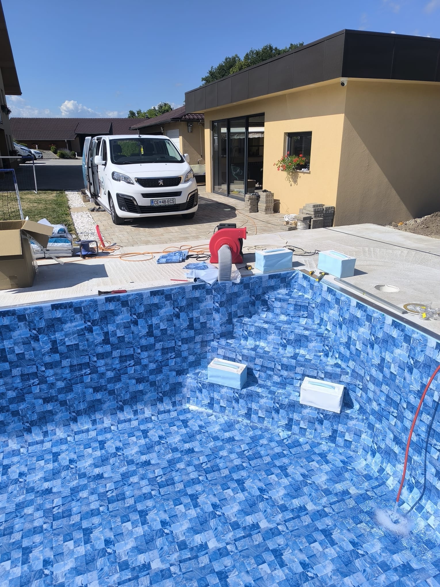 Bazen je bil izveden z natančno pripravo podlage, strokovno izvedbo tesnjenja in estetsko dovršeno montažo folije nove generacije.