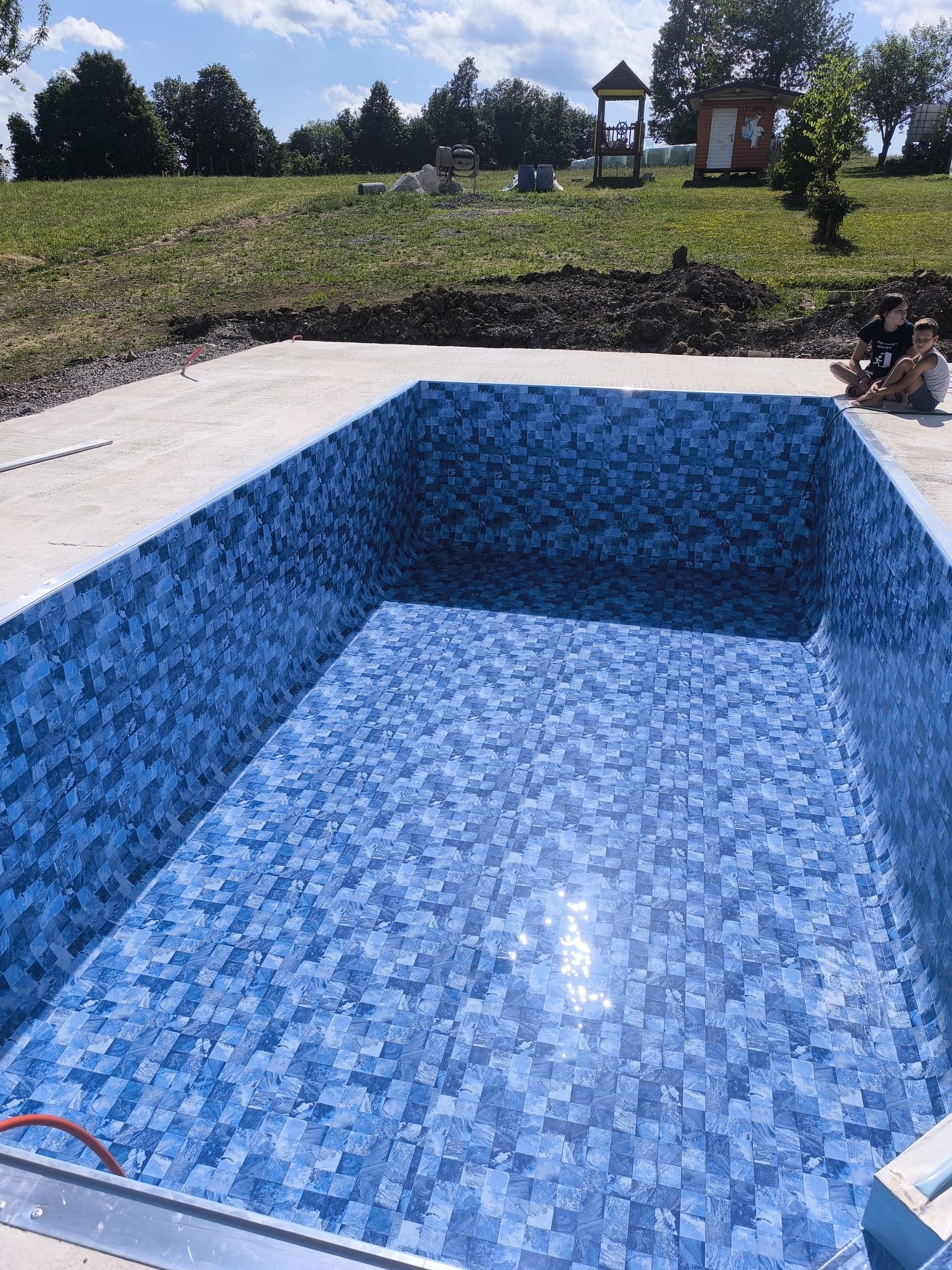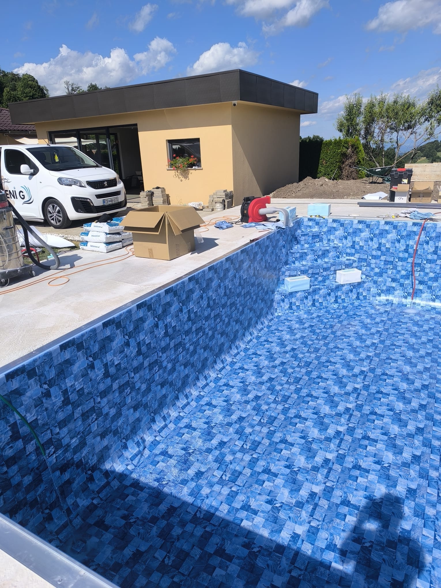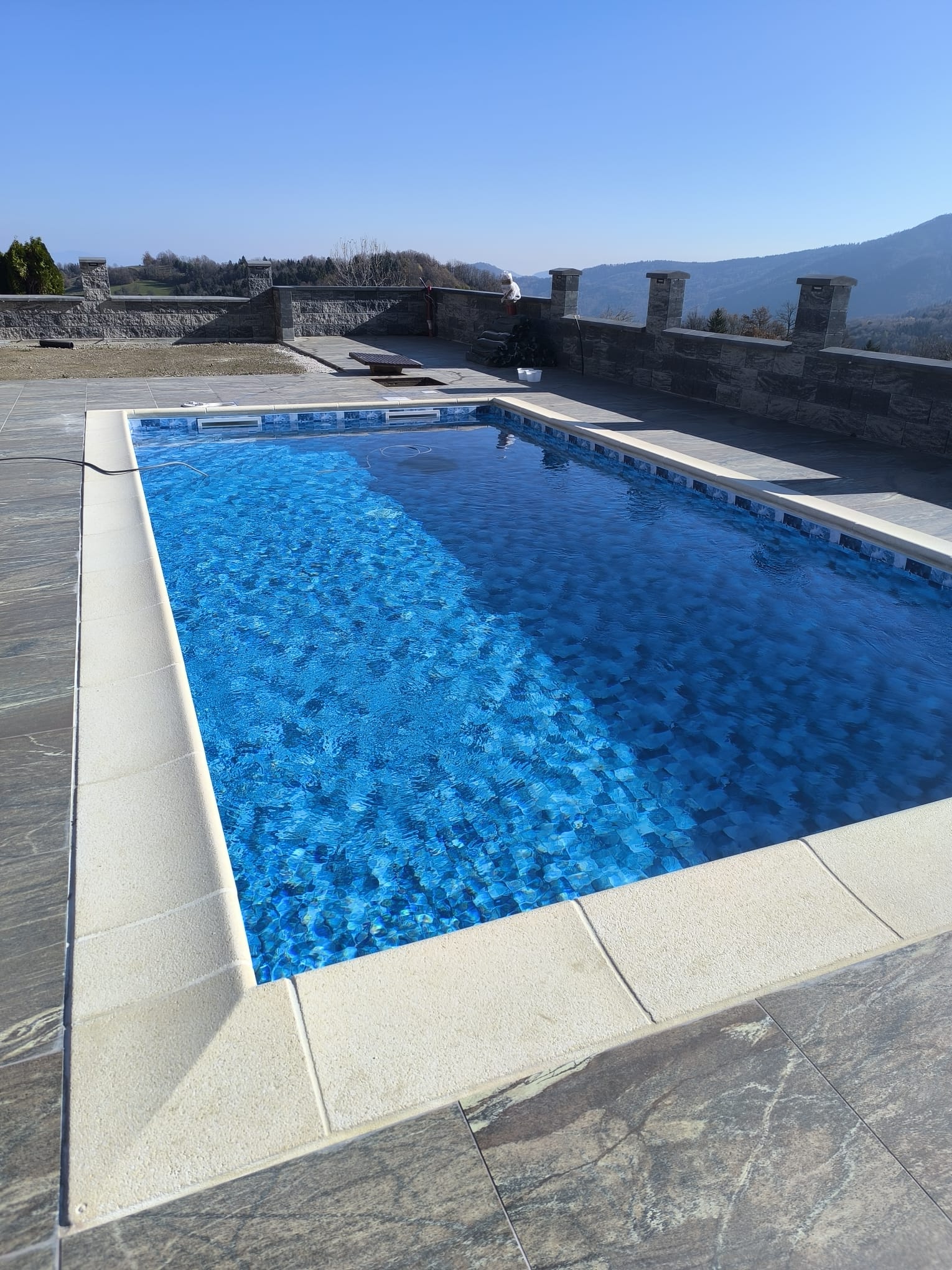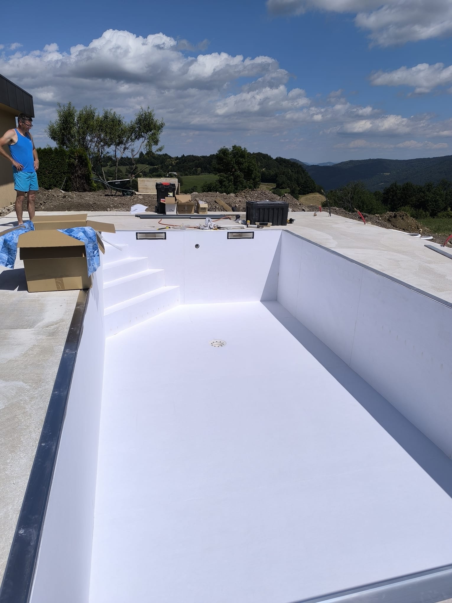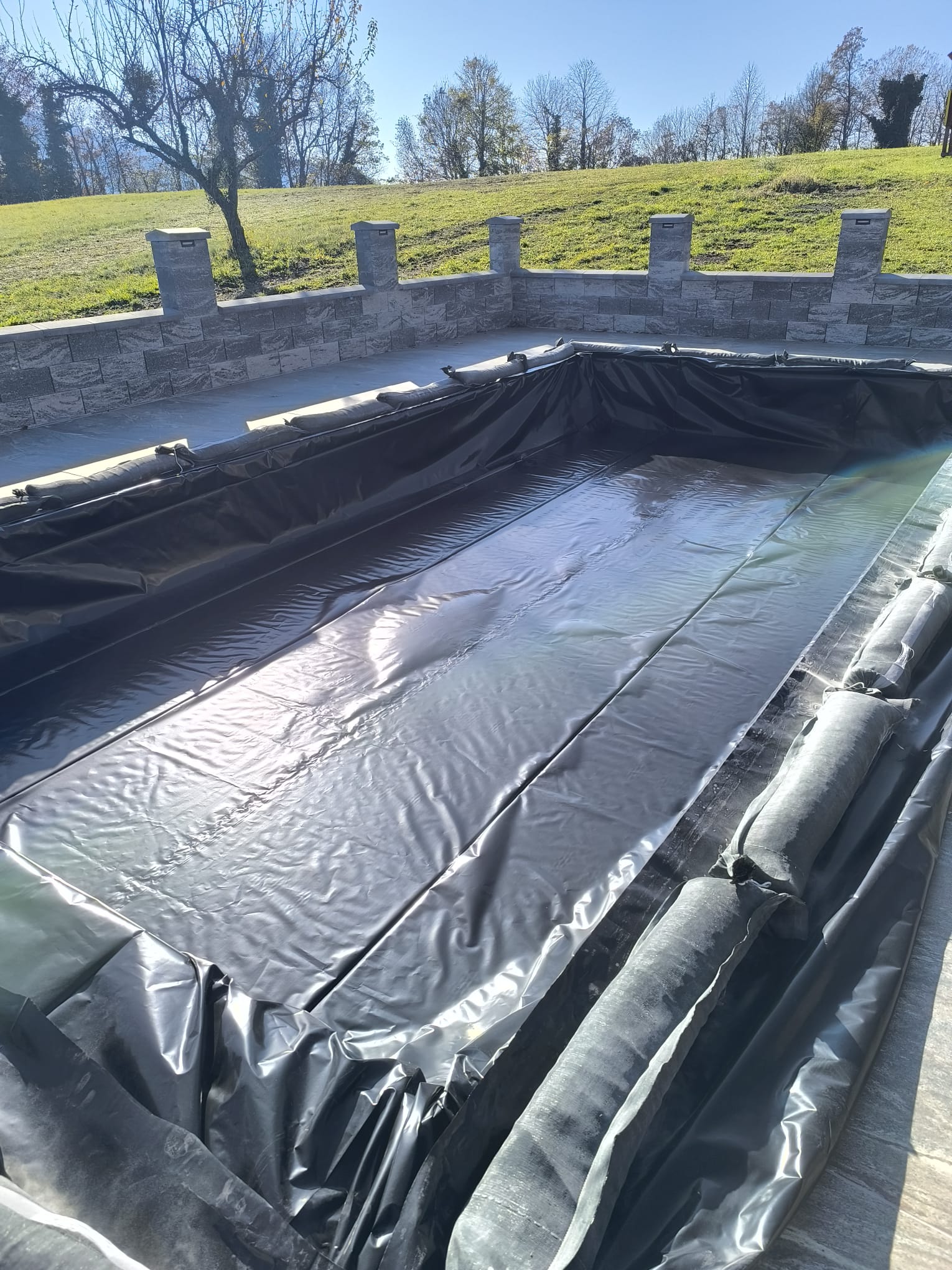 Bazen je bil izveden z natančno pripravo podlage, strokovno izvedbo tesnjenja in estetsko dovršeno montažo folije nove generacije.